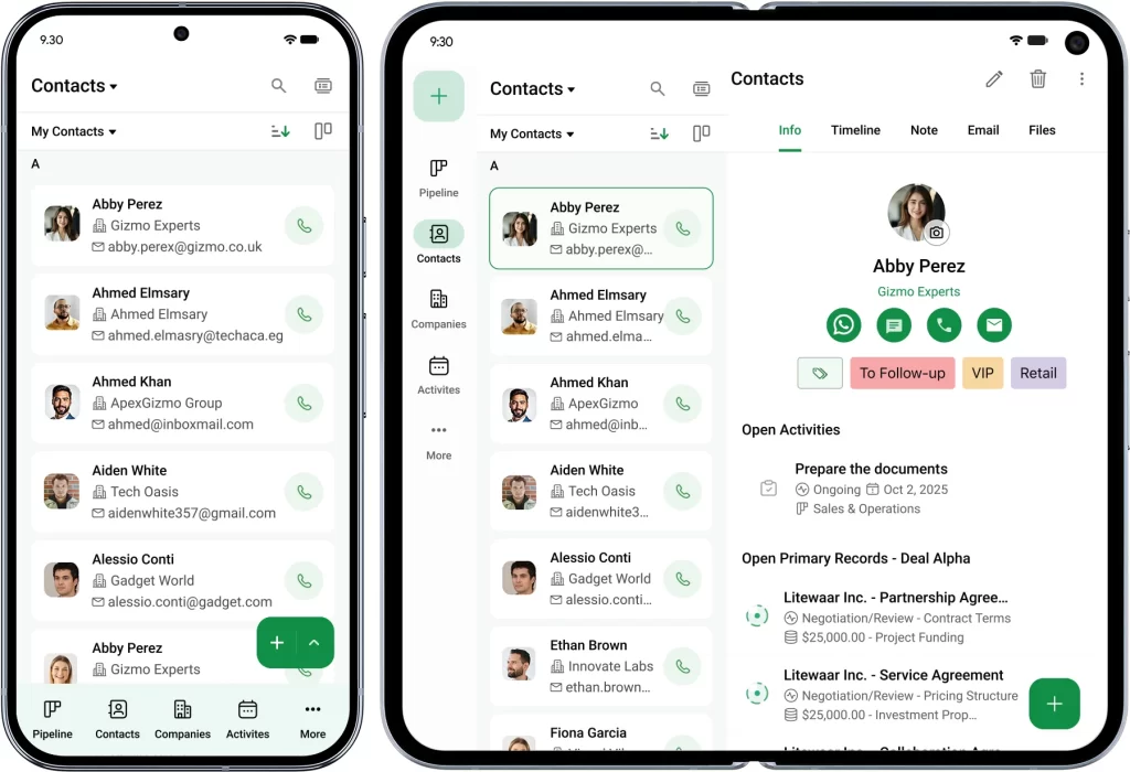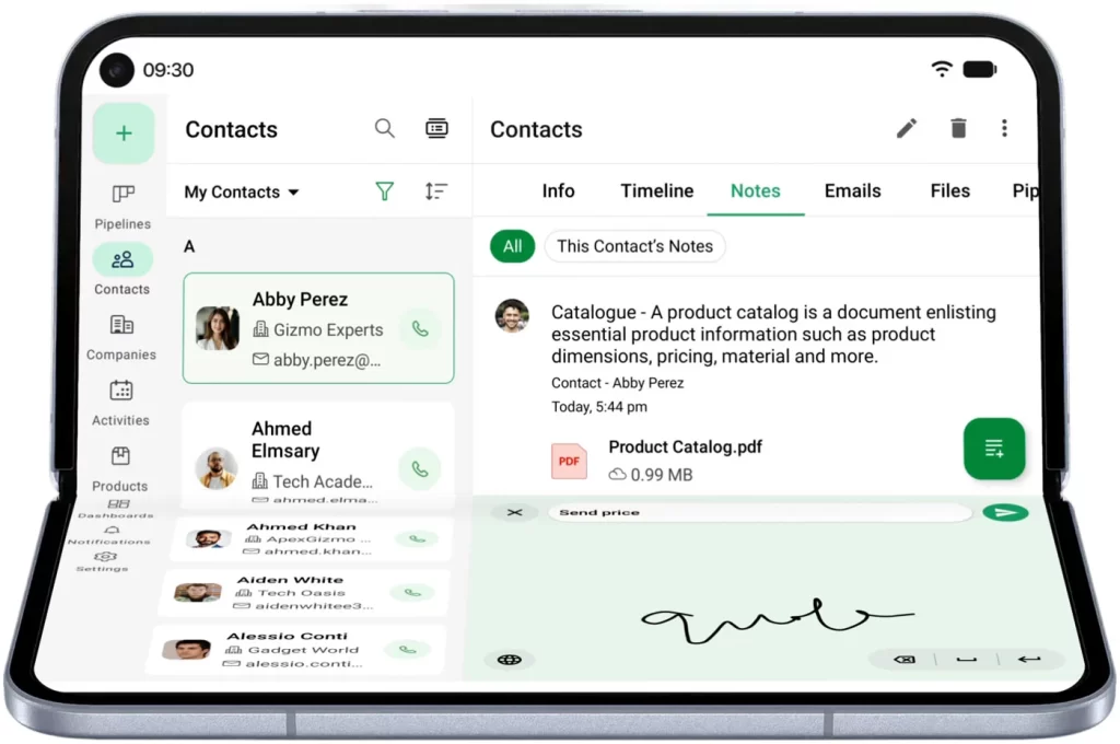 Bigin is designed to unlock the full potential of your Pixel Fold. With its flexible layout, you can switch from one large screen for enhanced data visibility to two screens that enable improved multitasking. For example, you can view contact details on one screen while taking notes on the other.